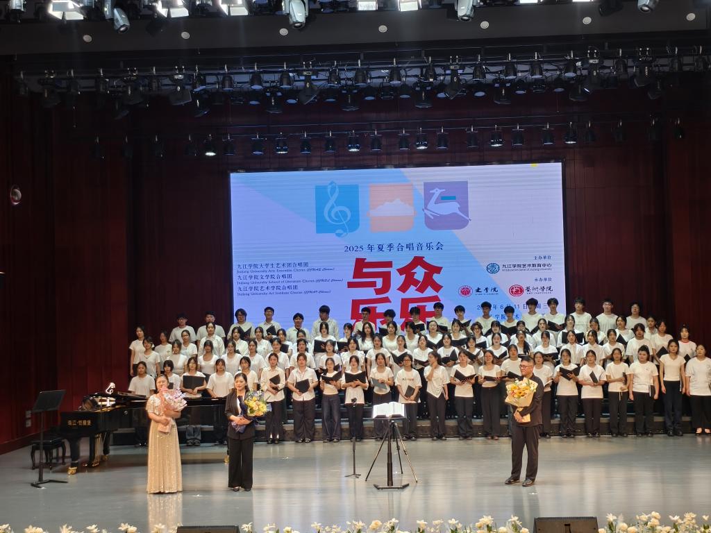 2025年6月11日晚,九江学院艺术学院音乐厅内华灯璀璨。由九江学院艺术中心举办的2025夏季合唱音乐会“与众乐乐”圆满落幕。本场音乐会由大学生艺术团合唱团、文学院合唱团、艺术学院合唱团联袂呈现这场以“众乐”为名的合唱盛宴。音乐会当晚,艺术学院院长张甘霖、文学院院院长李勤合、艺术学院党委书记欧阳时来、九江学院艺术教育中心主任、艺术学院副院长张栗娜、艺术学院副院长吴晨晖、文学院副院长柯镇昌、程亚恒、以及九江市音乐家协会合唱学会会长朱建军等领导嘉宾亲临现场,与广大师生一同沉浸在“众乐”的艺术氛围中。此次音乐会不仅是大学生艺术团合唱团筹备仅短短两个月的首场演出,更是九院非音乐专业学子以歌会友、共享音乐舞台的生动实践。音乐会上风格迥异的合唱作品在学子们真挚的演绎下,唱响了他们青春的交响,诠释了“与众乐乐”的深意。
