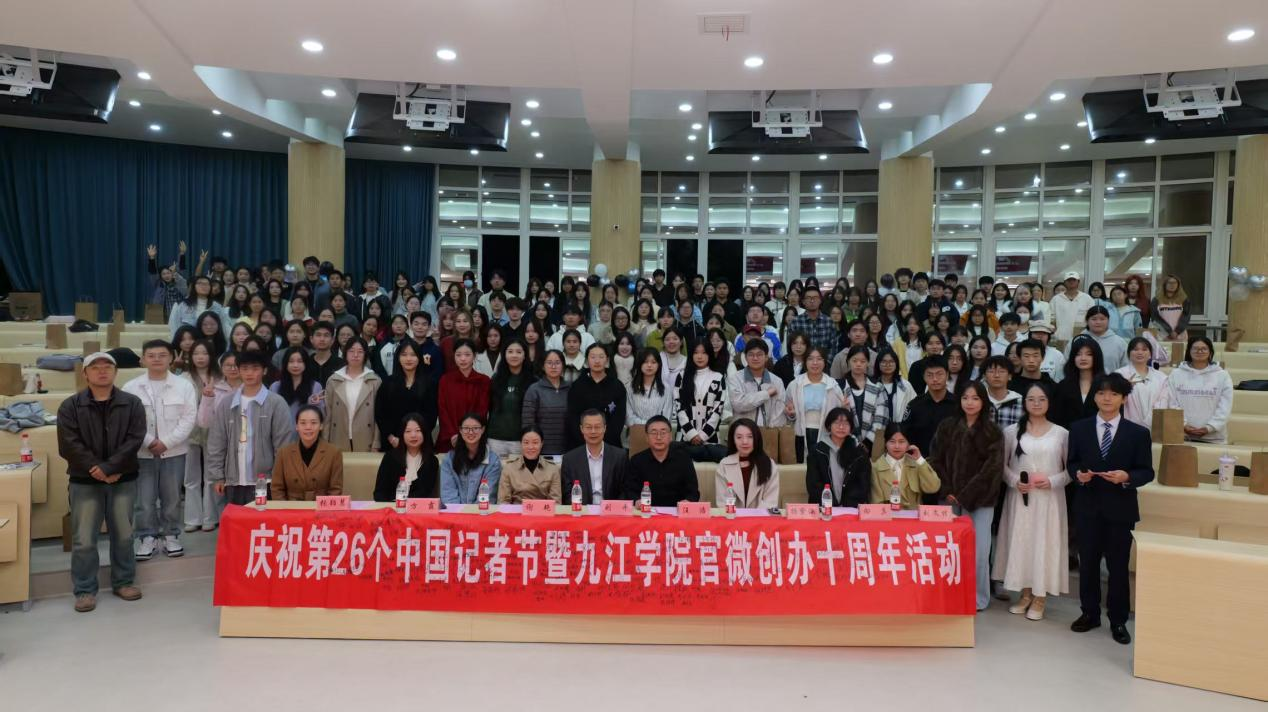 11月8日晚,学校在竞知楼阶梯教室2举行第26个中国记者节庆祝活动暨九江学院官方微信创办十周年纪念活动。校党委委员、宣传部部长刘平出席活动并为记者节采风大赛获奖学生颁奖。大学生新闻中心指导老师、新闻中心全体成员、校团委新媒体发展中心、各二级学院新媒体宣传骨干,以及江西职业技术大学、九江职业大学、江西财经职业学院等兄弟院校师生代表,共计200余人齐聚一堂,共襄盛会。