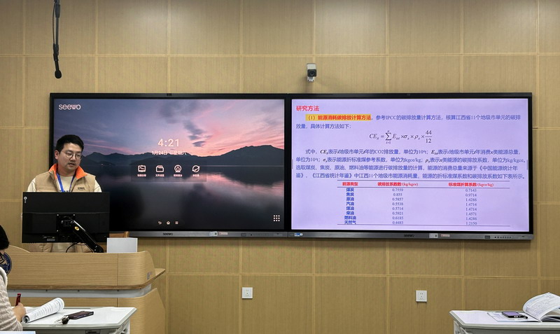 本次年会共设有21个专题分论坛,涵盖流域人地系统、水碳循环、全球变化响应、资源环境智能感知、生态环境遥感、地理大数据、智慧城市、国土空间治理、行为地理、地理教育等多个研究方向。与会者就数智技术赋能地理学创新、区域可持续发展路径等展开了深入研讨。我院闻熠博士在分论坛十五“湖泊湿地生态保持与综合治理”中作了题为《江西省能源消费碳足迹时空演变及驱动因素分析——基于2015-2024年面板数据研究》的报告,从能源与碳排放视角为区域绿色发展提供了数据支撑与政策启示。望勇博士在同一分论坛中汇报了题为《耦合发展与保护:县域国土空间协同治理的路径探索——基于江西省乐安县“多规合一”的实证》的报告,分享了其在县域空间治理与生态保护协同方面的最新研究成果。