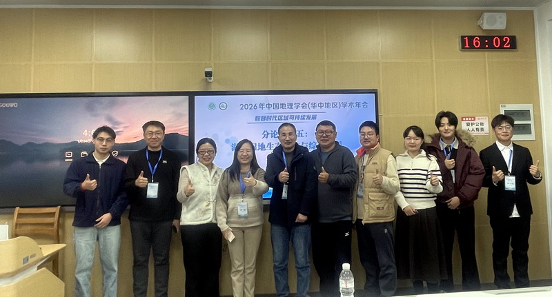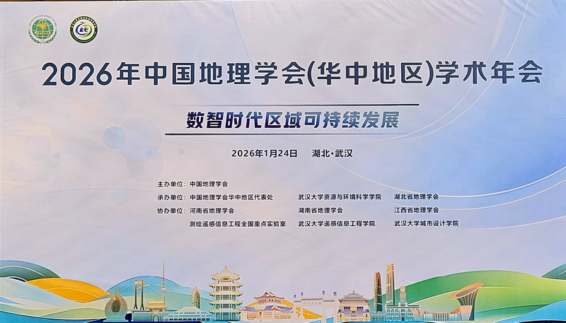 1月24日,2026年中国地理学会(华中地区)学术年会在武汉大学隆重召开。本次年会以“数智时代区域可持续发展”为主题,吸引了来自武汉大学、中国地质大学(武汉)、华中师范大学、河南大学、湖北大学、湖南师范大学、江西师范大学等全国40余所高校和科研院所的300余名专家、学者及研究生参会。我院副院长、江西省地理学会副理事长陈海龙与闻熠、望勇、雷彬三位博士一同参加了此次学术盛会。