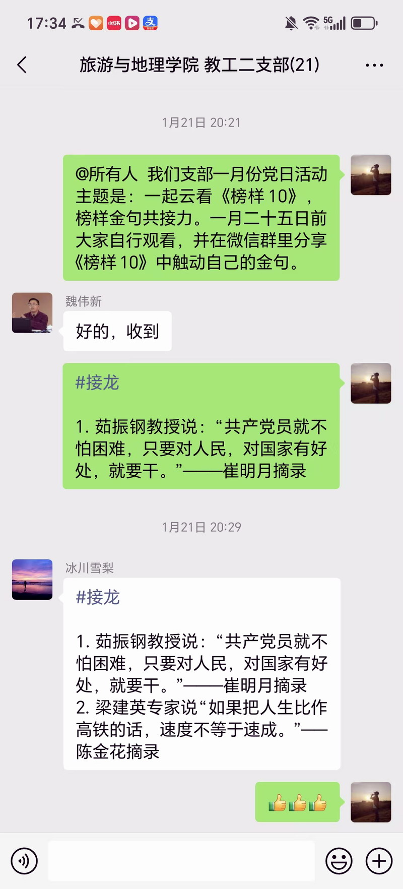 金句接力环节是此次活动的亮点。观看结束后,支部以线上接龙的形式开展榜样金句分享,全体党员教师依次转发自己印象最深刻的榜样金句,并结合自身教学、科研及服务地方的工作实际,解读金句内涵、畅谈践行思路。把论文写在大地上,把成果留在农民家,茹振钢教授的金句引发党员教师共鸣,大家表示,将以榜样为标杆,立足旅游与地理学科优势,把科研做在九江文旅发展的一线,助力地方文旅资源活化与产业升级;梁建英巨人的肩膀不好站,必须让自己成为巨人的坚守,激励着党员教师深耕教学一线,精益求精打磨课程,用心培育兼具理论素养与实践能力的文旅复合型人才;罗胤扎根基层、为民服务的担当,也让党员教师深刻认识到,作为高校党员教师,既要教书育人人,更要坚守教育初心,践行服务使命,主动回应地方发展需求。