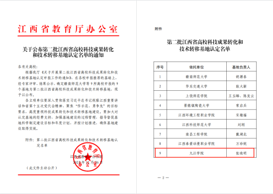 近日,根据江西省教育厅印发的《关于公布第二批江西省高校科技成果转化和技术转移基地认定名单的通知》,我校通过专家评审,成功获批为江西省高校科技成果转化和技术转移基地。