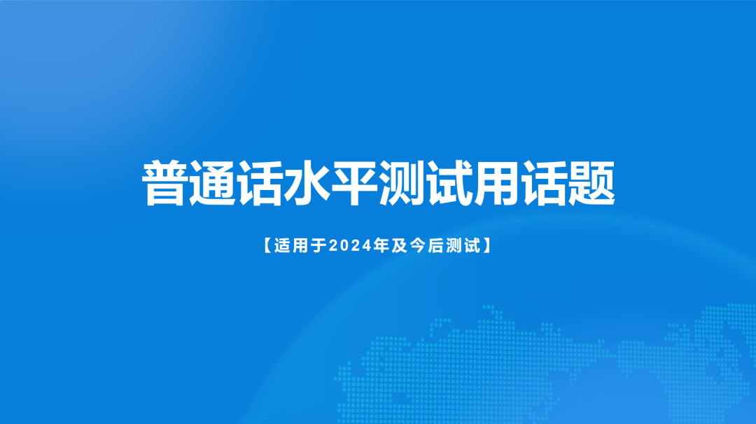 《普通话水平测试实施纲要》(2021年版)已于2024年1月1日起正式实施。新版纲要普通话水平测试用话题总数由30则增至50则,个人话题和社会话题两类话题各占25则。其中,选自2003年版《纲要》话题25则,其中1则话题拆分为2则,计为26则(其中4则完整保留原有题目,余者均有不同程度修改);选自1994年版《普通话水平测试大纲》话题2则,新研制话题22则。话题更具开放性、时代性,旨在更好地适应测试发展需要。