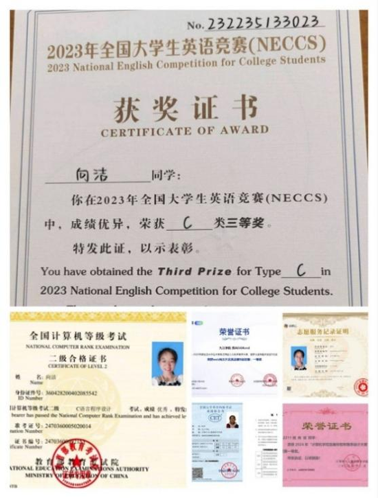 在学业与科研领域,向洁同学始终以“勤耕不辍”为座右铭,展现出计算机专业学子的钻研精神。大学期间多次荣获校“三好学生”荣誉称号,多次校级奖学金,“单项嘉奖”,还连续两年斩获国家励志奖学金。先后考取英语四、六级证书与计算机二级证书,筑牢专业知识根基。