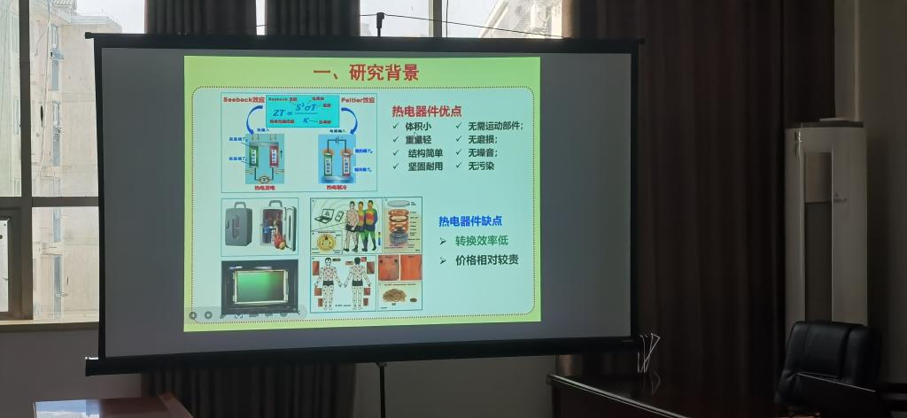 余健博士以“Ni异价掺杂显著提升CoSbS化合物热电性能”为题,介绍了热电转换技术的研究背景、发展趋势和目前存在的问题,并运用能带理论和电声相互作用解释了Ni异价掺杂协同提升副硫锑CoSbS电热输运的机理,并与在座老师对该材料在工程领域的应用,以及后期拟开展的工作进行了探讨交流。
