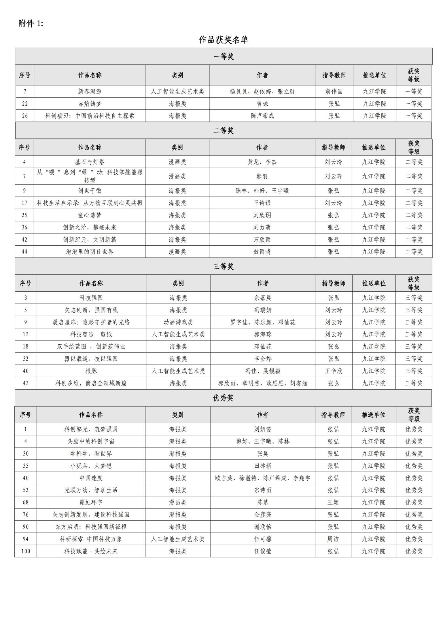 近日,由江西省科学技术协会、江西省教育厅、江西省科学技术厅、江西省文化和旅游厅、共青团江西省委联合主办的江西省第十一届大学生科普动漫创作大赛获奖名单揭晓。我校师生表现优异,共斩获一等奖3项、二等奖8项、三等奖8项和优秀奖11项,获奖总数与人次较上届显著提升,增幅均达100%。艺术学院张弘老师获评“优秀指导教师”,学校荣获“优秀组织奖”。