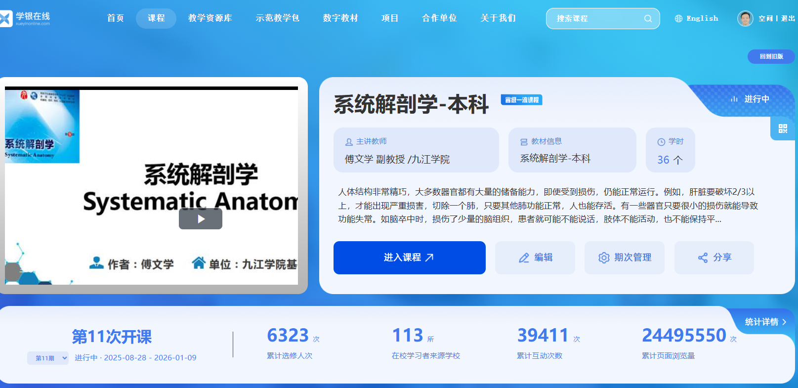 课程自2020年上线以来,已高质量运行11期。在学银在线、智慧树等平台运行,仅学银在线浏览量突破2400万次 ,吸引包括郑州大学、中国药科大学在内的100余所高校 学生选课,累计选课人数超万人 ,互动逾7万人次 ,有效缓解了兄弟院校优质解剖学课程资源不足的困境。