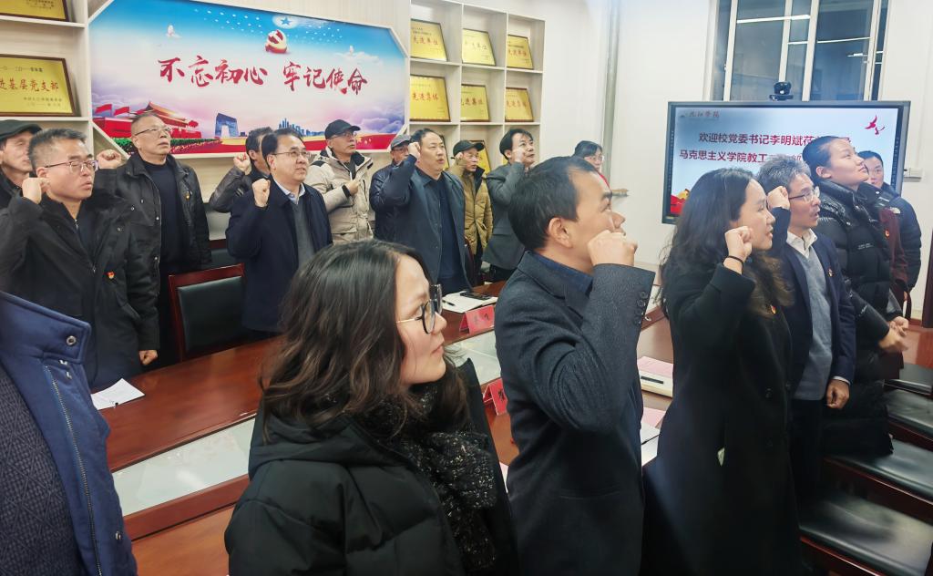 活动在庄严地重温入党誓词中开始。崔颖丽首先向李明斌汇报了2025年支部换届工作的相关情况。邹菊如等3名党员代表就党的二十届四中全会精神融入思政课的实践路径与创新思路进行了交流研讨。