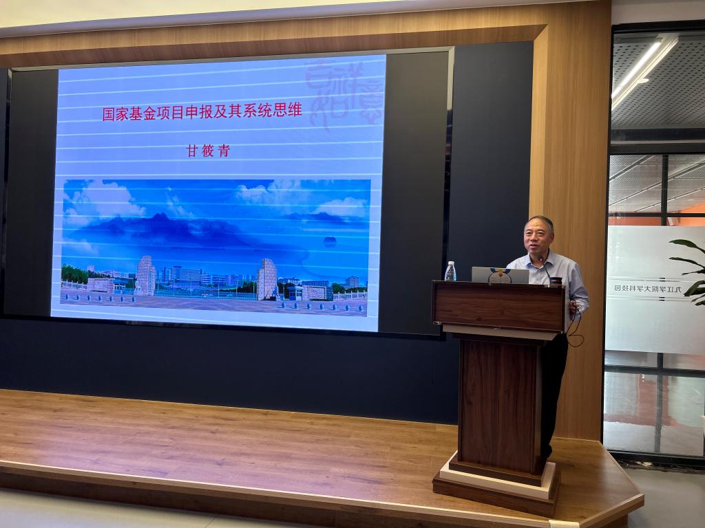 甘筱青从九江“山”、“江”、“湖”的人文地理优势切入,以习近平总书记2016年“七一”讲话为引言,谈到治学宗旨与理念。以他自1995年获清华大学应用数学博士以来承担的9个国家级科研基金项目为主线,梳理了对申报国家基金项目的思索,提出确定申报领域和题目应结合自身专业特色、区域特色、社会热点和自身研究经历;题目不宜过大,而要围绕内容“从小切入,小题大作”,注意新颖性;研究内容既要有先进性,又要从实际中来,做到“顶天立地”;研究队伍,搭配合理,可选择适当的合作单位;内容上要逻辑严谨、系统思维,要体现自身研究工作的“与众不同”之处;厚实团队基础,铺垫前期成果,精心打磨申报书。同时,他还分享了国家基金项目申报应注意的准则、细节和填报技巧。