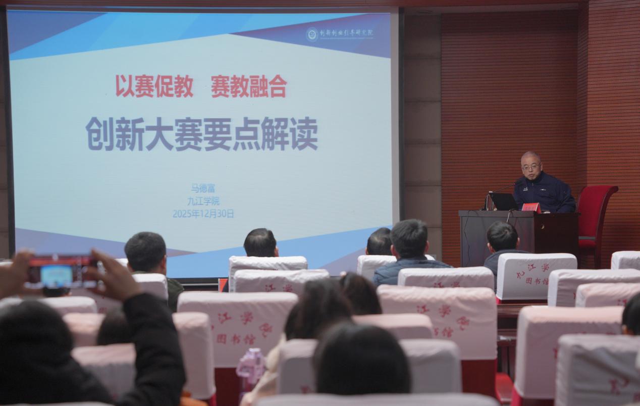 为激励表彰先进,聚力谋篇布局,12月30日上午,2025年九江学院创新创业教育表彰暨中国国际大学生创新大赛(2026)启动会在学校逸夫图书馆报告厅举行。校党委委员、副校长吴维勇出席会议并讲话;全国高校创新创业投资服务联盟秘书长、国家级创新创业导师马德富老师应邀作辅导报告。