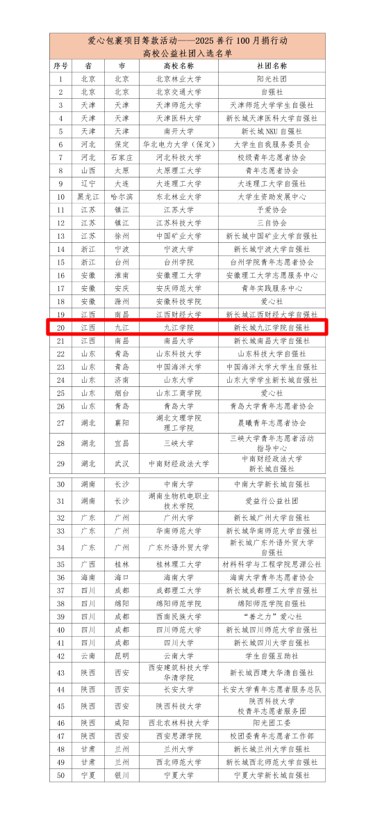 我校新长城九江学院自强社在学生工作处(学生资助管理中心)的指导下,凭借扎实的社团建设基础、丰富的公益实践经验和详实可行的活动策划方案,赢得了主办方的高度认可,最终成功入选。