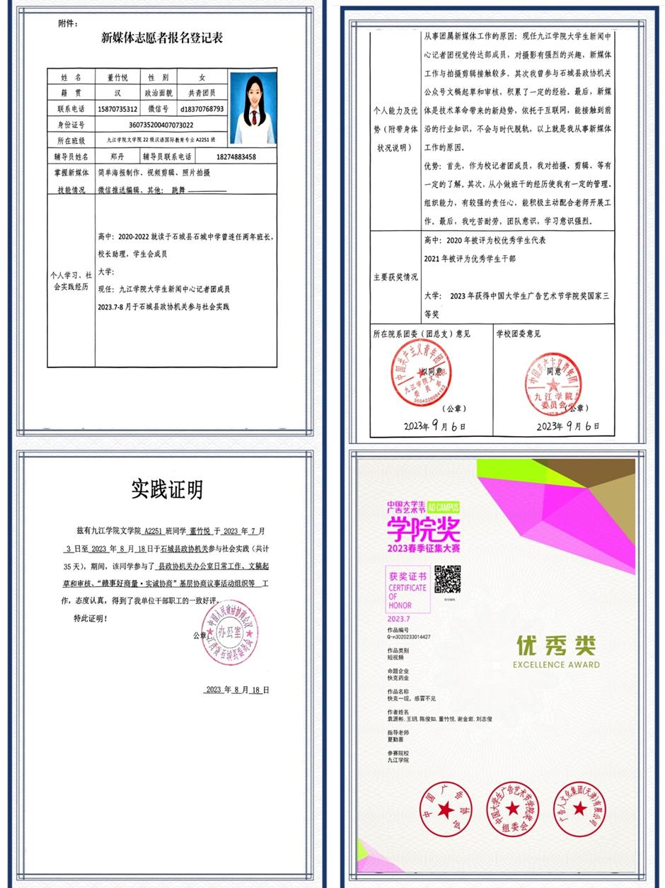 在职业规划大赛中,董竹悦同学展现出了出色的表现。她在比赛中充分发挥了自己的专业知识和职业素养,在策划、组织和展示等方面都表现出了优秀的能力。通过自己的精心准备和全力以赴,她成功地呈现了一个完整、富有创意的职业规划方案,给评委和观众留下了深刻的印象。